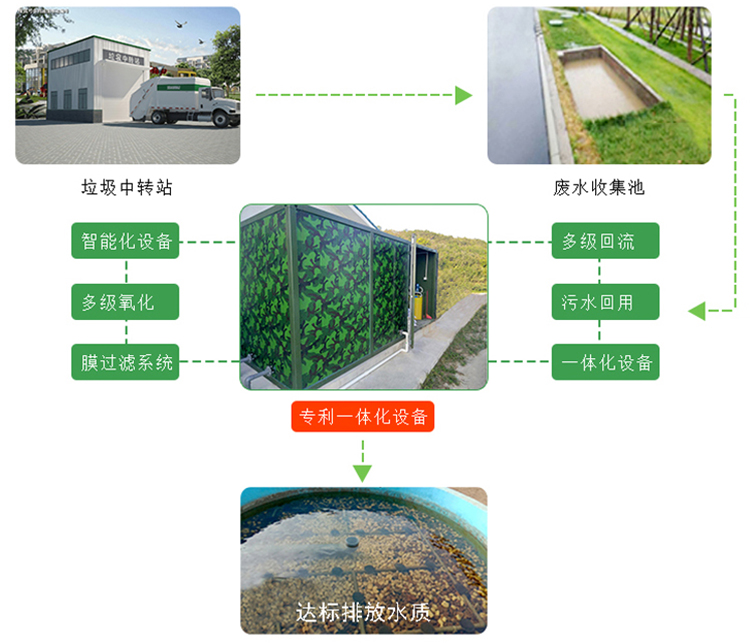 1、将中转站废水收集到收集池,后泵送到本公司专利(一种垃圾中转站废水处理智能集成设备)设备对废水高效多级氧化处理,膜过滤系统,消毒脱色等一系列处理工艺,让中转站废水达标排放。