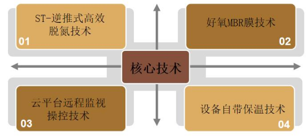 “ST-逆推式高效脱氮+好氧MBR”技术核心主要在于四个方面:ST-逆推式高效脱氮技术、好氧MBR膜技术、云平台远程监视操控技术、设备自带保温技术。