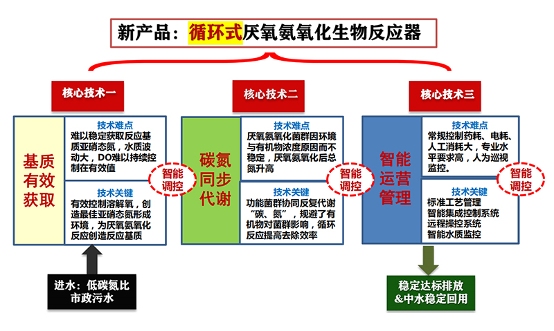 针对技术瓶颈问题,我们找到了正确的突破口和解决方法,最终形成了全过程污染物降解新工艺体系。我们研发的低碳高效脱氮新工艺核心在于循环式厌氧氨氧化生物反应器,该系统搭载三大核心技术,实现了厌氧氨氧化反应基质的有效获取、碳氮反复循环代谢以及全程智能调控等多项技术突破。