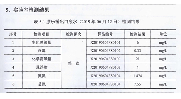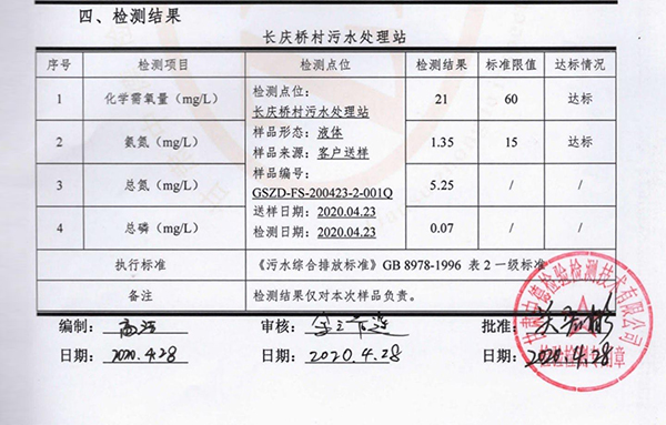 出水水质检测报告:COD浓度:21mg/L、氨氮浓度:1.35mg/L、总氮浓度:5.25mg/L