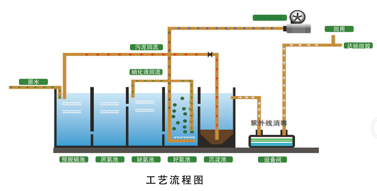 AAO-MBR技术,通过优化控制污水的反应时间,进行有机物氨化、硝化反硝化作用、微生物代谢功能、释磷聚磷等多种生化反应的结合去除污染物。设备运行中少量剩余污泥回流到前端,达到除磷效果,几乎不外排污泥或定期委外处理,经自吸泵吸入经过紫外UV光解消毒再进入清水池,经消毒处理除去细菌类微生物后水排。