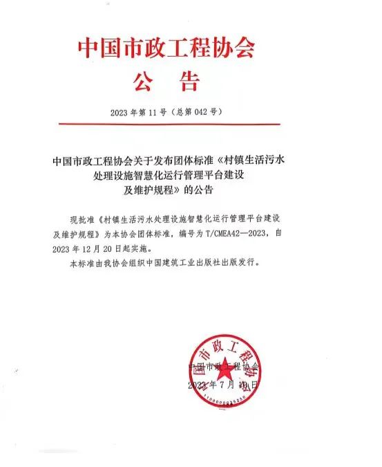 2023年7月10日,团体标准《村镇生活污水处理设施智慧化运行管理平台建设及维护规程》(T/CMEA42-2023)经中国市政工程协会批准发布,并将于2023年12月20日起正式实施。
