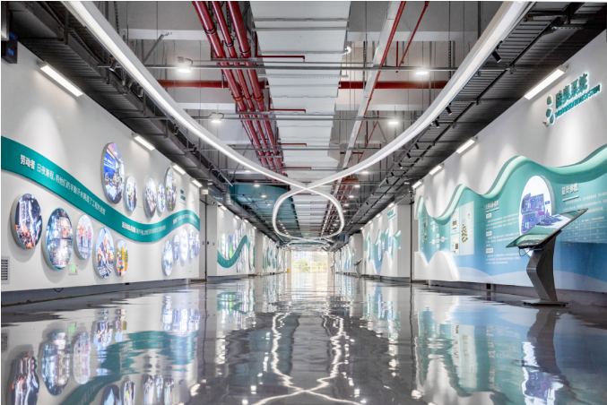 项目原址是混凝土预制厂,建设期间克服场地小、高差大,四周地势崎岖、可用土地十分有限等不利因素影响,沿河道山坡地形融入式设计建造,利用钢筋桁架板预制拼装工艺、全方位盘扣支架应用、定型化设施装备等新技术应用,打造全地下水质净化厂建设形式+上盖景观公园,生产设施位于地下,上盖公园对外开放,把科普廊道、景观公园、海绵城市、时代展馆、沙湾驿站与水质净化厂建设结合起来,实现厂城融合。