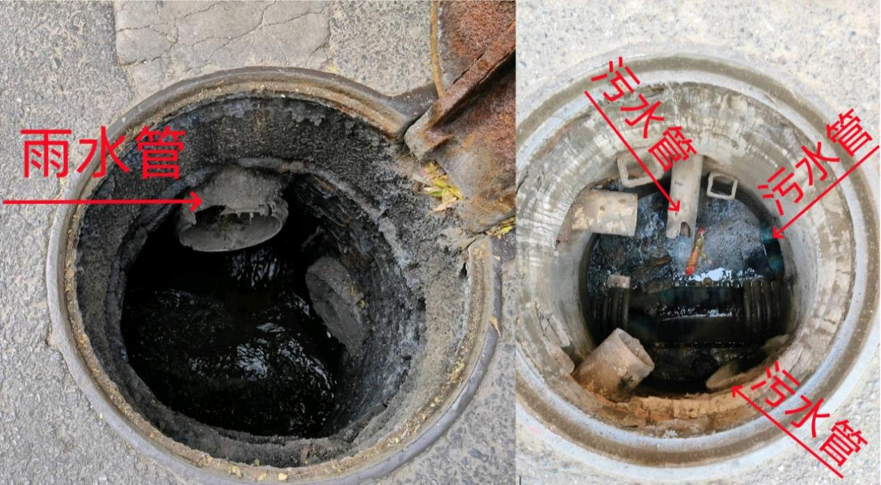 2023年12月6日,督察组现场督察发现,西宁市排水管网雨污混流问题突出,左图为污水井内混接雨水管,右图为雨水井内混接污水管