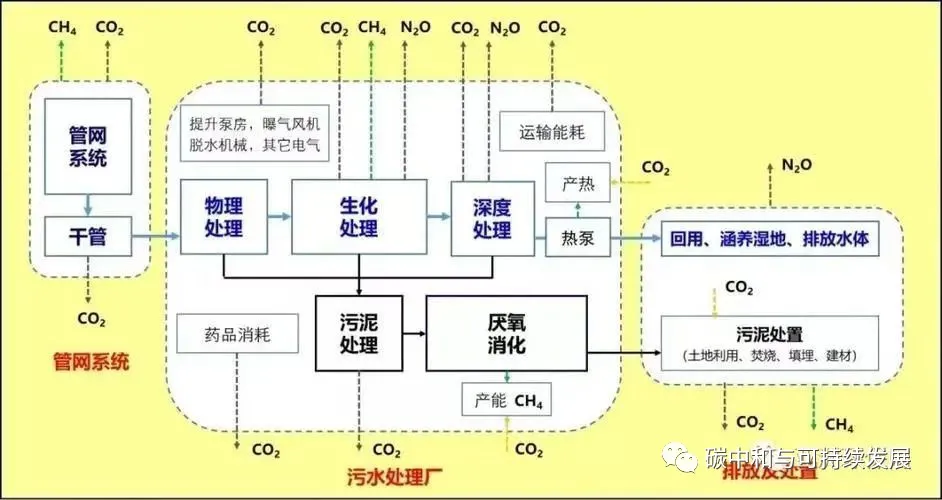 污水处理过程中会排放二氧化碳、甲烷和氧化亚氮。污水处理需要消耗大量燃料和药剂,间接排放大量温室气体,处理过程本身也会直接排放温室气体。