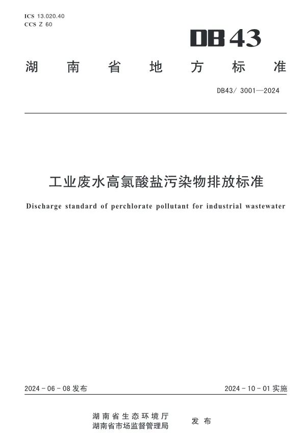 湖南省生态环境厅与省市场监督管理局近日联合发布了《工业废水高氯酸盐污染物排放标准》(DB43/ 3001—2024)(以下简称《标准》),自2024年10月1日起实施。