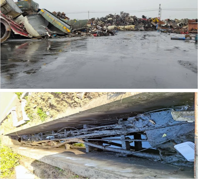 一是水污染方面。督察发现,拆解过程产生的废机油等危险废物直排雨水管网流入周边河道,对水体造成严重污染。随机在刘府镇刘西宾馆东南侧路口雨水管道内采样监测显示,石油类浓度为7.33毫克/升,超过《地表水环境质量标准》Ⅲ类标准145倍。