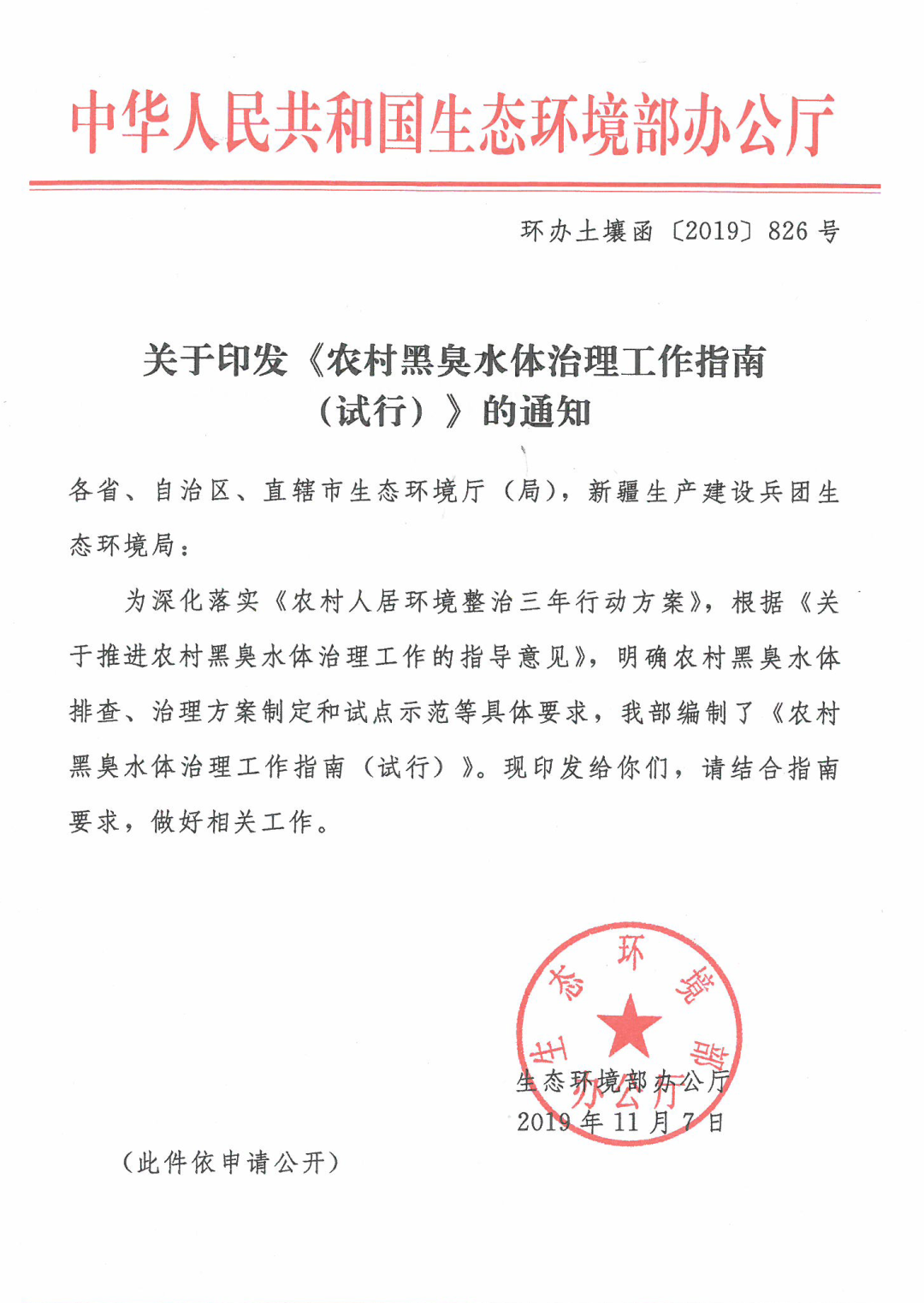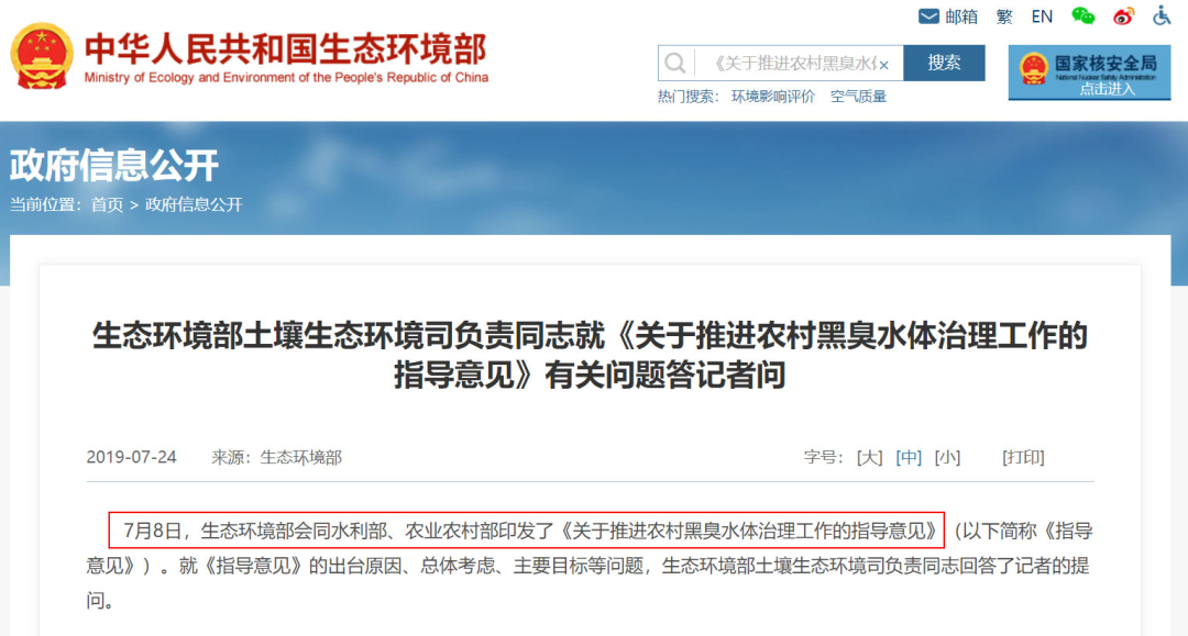 3、生态环境部土壤生态环境司负责同志就《关于推进农村黑臭水体治理工作的指导意见》有关问题答记者问,生态环境部,2019-07-24