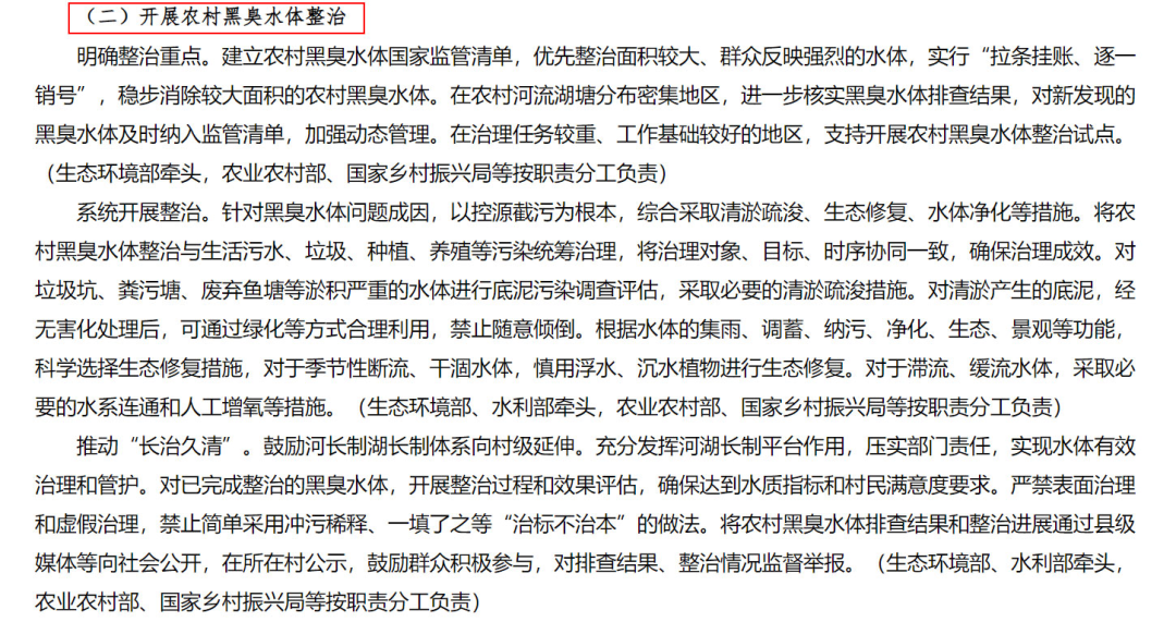 明确整治重点,建立农村黑臭水体国家监管清单,实行“拉条挂账、逐一销号”;·系统开展整治,以控源截污为根本,综合采取清淤疏浚、生态修复、水体净化等措施;·推动“长治久清”,严禁表面治理和虚假治理,鼓励群众积极参与监督举报等。总之,到2025年,我们要基本消除较大面积农村黑臭水体,还要为下一步继续深入治理农村黑臭水体积累可复制的经验。