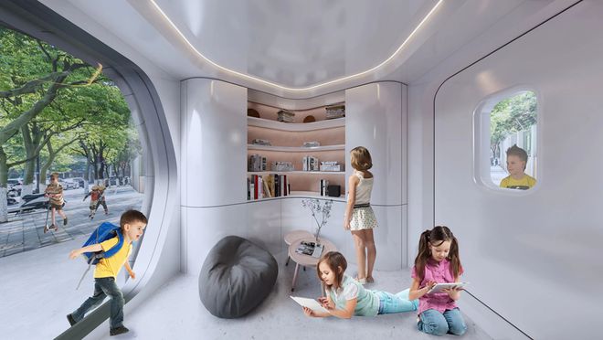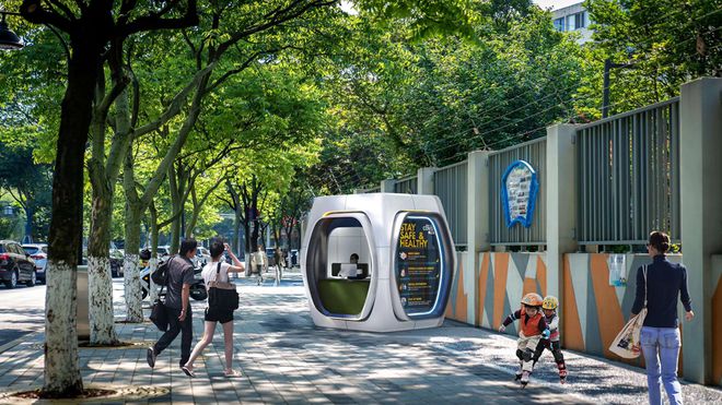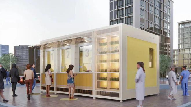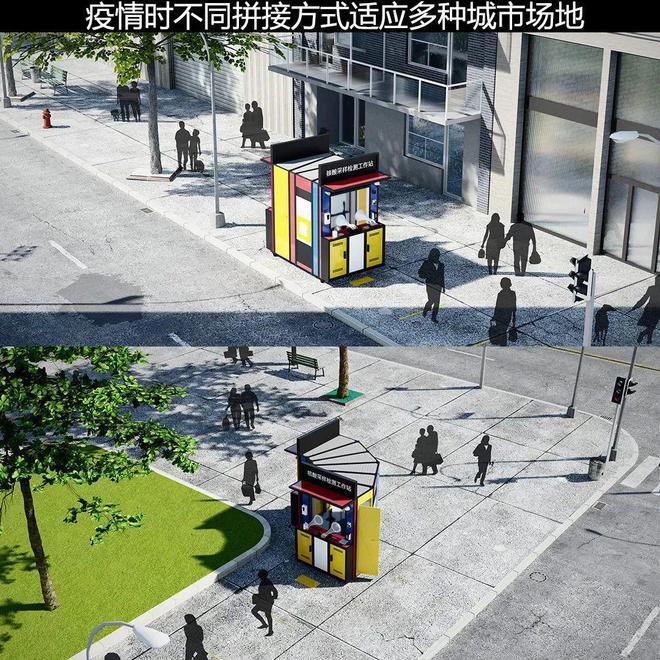 设计充分考虑平疫转换,疫情后检测亭可改造为运动补给站、共享书吧、mini便民服务站、萌宠之家等,进行二次利用,自成一道城市街景。