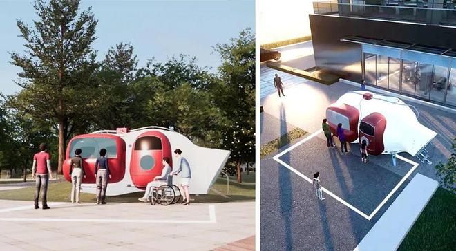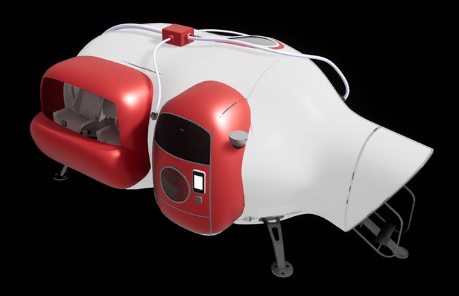 建筑采用“充气膜”+“行李箱”作为设计概念,将空间分为缓冲区和工作区,缓冲区是一个坚硬的行李箱,收纳设备,家电等固定设施,工作区则是柔软的可折叠充气膜,平时收纳在行李箱内,工作时充气展开。
