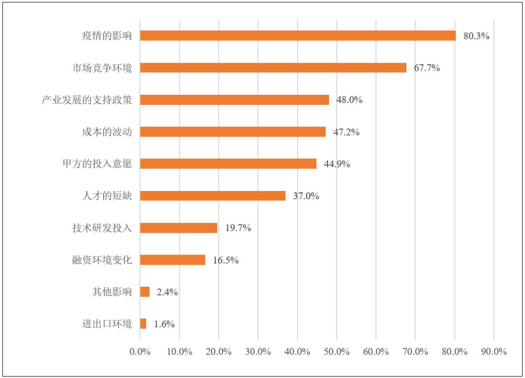 调查结果显示,疫情是最多参与调查单位反馈的经营状况影响因素,该比例高达八成。受当前新冠疫情仍在部分地区持续反复影响,市场需求萎缩,行业企业易陷入营收下跌,利润收缩,资金链压力增大的困境中。