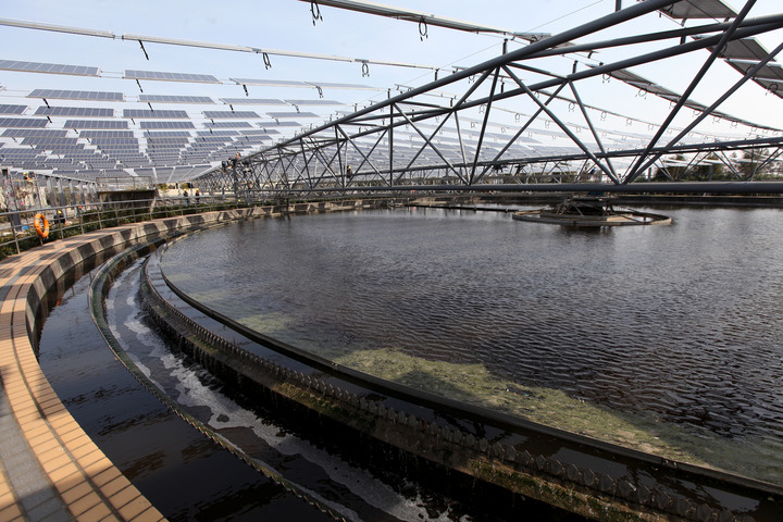 一般来说,污水处理厂占地面积大,周围建筑相对较少,高层建筑少,而且污水处理厂的池体、屋顶面积大,建筑质量较好,非常有利于光伏组件的安装和高效利用。可以根据综合生化池的不同分类,通过在污水处理工艺末端—澄清池顶部加设顶棚的方式,降低水池上方风速,改善局部小环境,减少池水蒸发,提高池水温度,增加污水处理收益。