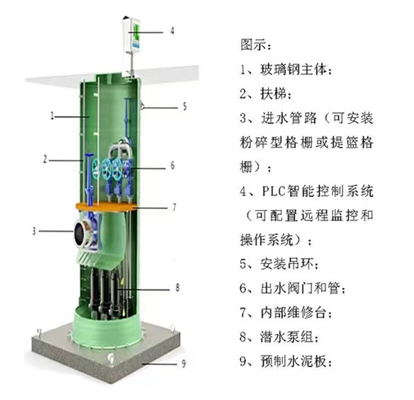 智能一体化预制泵站包含了五大主要系统:筒体主体、管道系统、潜污泵系统、格栅系统和PLC智能控制系统。智能一体化预制泵站集成了泵到维修间的所有需要的部件,泵站直径、最大高度、流量、扬程等均可按照用户的需求量身定制。