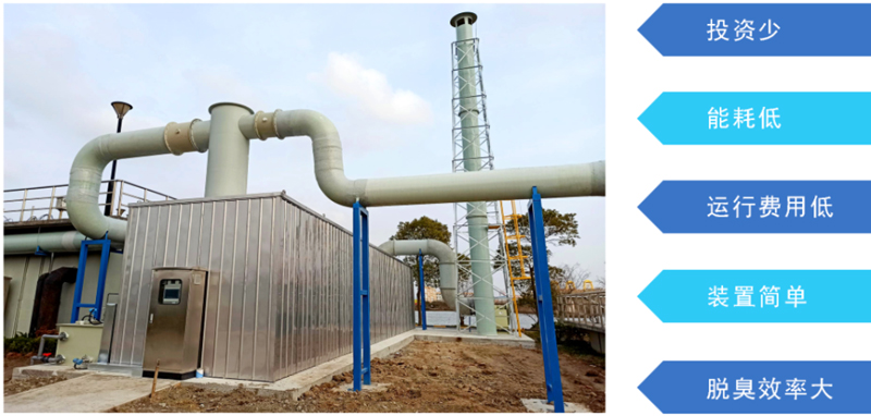 利用微生物的生物降解作用对臭气物质进行吸收和降解从而达到除臭的目的。臭气通过湿润、多孔和充满活性微生物的滤层。利用微生物细胞对恶臭物质的吸附、吸收和降解功能,微生物的细胞个体小、表面积大、吸附性强、代谢类型多样的特点,将恶臭物质吸附后分解成CO、HO、HSO、HNO等简单无机物。 技术特点