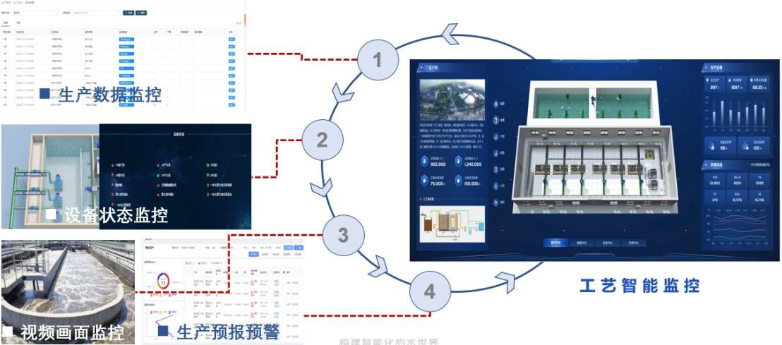 与自控系统数据联通,对污水处理厂实现“四位一体”多角度监控工艺,达到“监”、“控”一体,协同管理。生产监控作为集团的“千里眼”,对生产管理中最重要的一环——水处理过程进行全局动态、实时监督,对异常进行预警、超标进行报警,并无缝触发人的协同,完成事件的闭环管理,避免政令不出办公室的窘境。